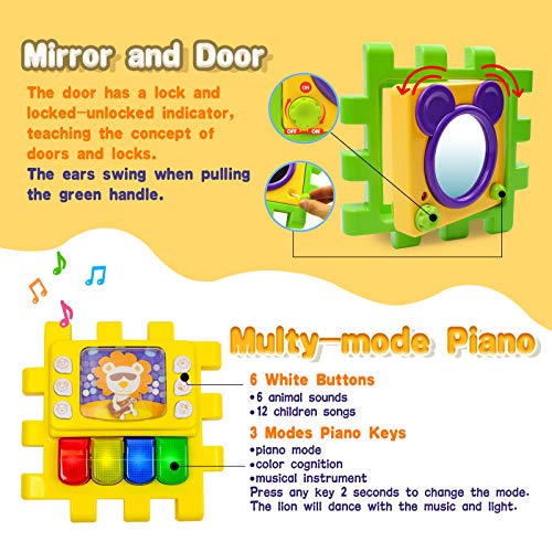 【Educational Toy】Learn while playing! Babies can improve fine motor skills with simple exercises, such as turning gears and flipping colored beads. Shape matching games and six buttons with animal sounds guide babies to recognize basic shapes and animals. learn basic life knowledge through the design of clock, mirror and door opening device. The piano key design with light allows children to enjoy music and promote sensory development.