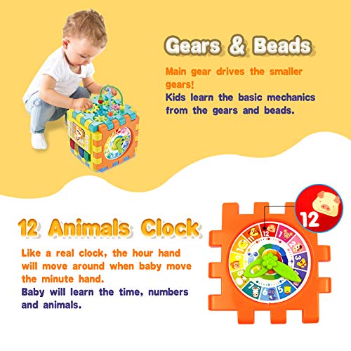 【Endless Fun】This toy that combines lots of educational activities will keep your baby focused for a long time. It includes bead maze, spining gear, multi-mode Piano, Animal Buttons, learning clock, roating bead, shape sorter and lovely mirror & door. No need to buy multiple different toys, your child can enjoy more. Save money and reduce confusion.