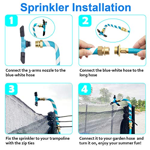 Use Suggestion: Easily attaches to any trampoline top directly with the zip ties that come in the product. Two kinds of adjustable zip tie included. Please use one zip tie within a distance of 15-20 in, and keep a certain space to avoid poor water flow. Please turn the water on slowly when you use it, control the water pressure of the sprinkler at a low level to extend the service life.