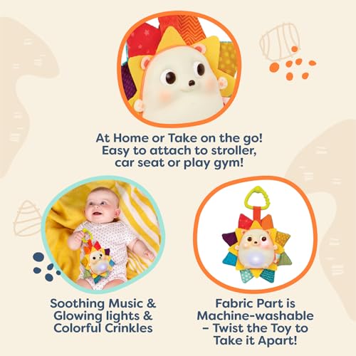 Have a ton of sensory fun with the RainGlow Buddy from B. baby! This colorful hedgehog toy comes with relaxing music, glowing lights, and soft fabric. Babies can build their auditory, tactile, and visual skills as they explore these fun features. This sensory toy is easy for tiny hands to hold, so grasp, shake, and play away! You can easily take the fun on-the-go too – just attach this baby toy’s adjustable fabric loop to a stroller, car seat, or play gym. Not to mention, the fabric part of this adorable buddy is machine-washable for a convenient clean-up! 3 x AAA batteries are required and included. Recommended for newborns and older.