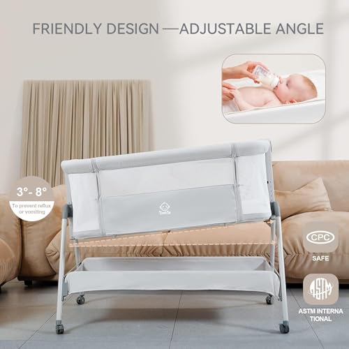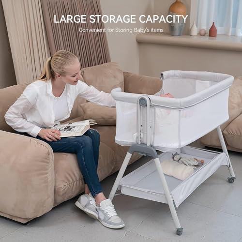 Baby Bassinet with Mattress, Bassinet Co Sleeper 3-in-1 Bedside Bassinets with 5 Adjustable Height, Baby Cot Cribs with Mosquito net and Carrying Bag, for 0-6 Months Babies(Gray)