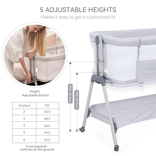 [Height Adjustable] The baby co sleeper has 5 level adjustable height, you can easily adjust through the leg button to suit the adult bed height. The open side of the bassinet designed with safety lock that only adult can operate.