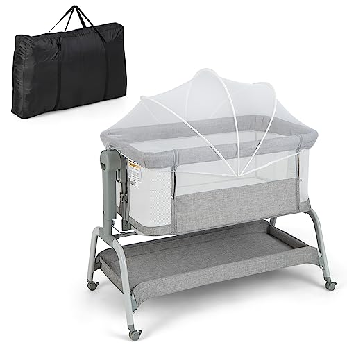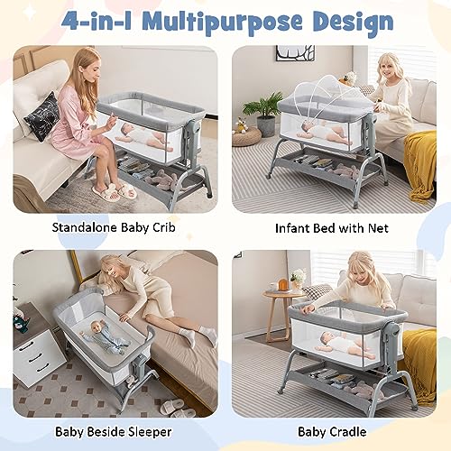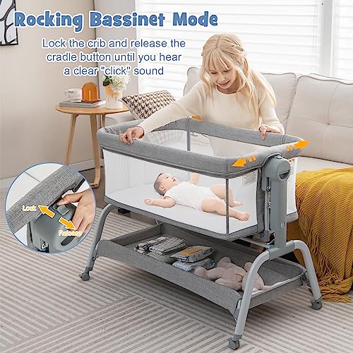 BABY JOY 4 in 1 Baby Bassinet with Mattress, Baby Bedside Sleeper w/Rocking Mode, 6 Adjustable Height, Mosquito Net & Lockable Wheels, Portable Baby Cradle Travel Crib w/Carry Bag (Light Grey)