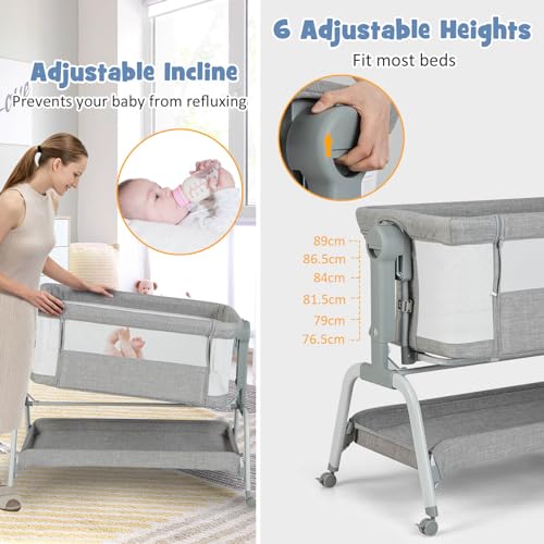 6 Adjustable Height & Incline Design: Featuring 6 adjustable heights, this newborn bedside bassinet fits most beds. What’s more, the adjustable incline design of 2°-6° prevents your baby from refluxing and spitting milk.