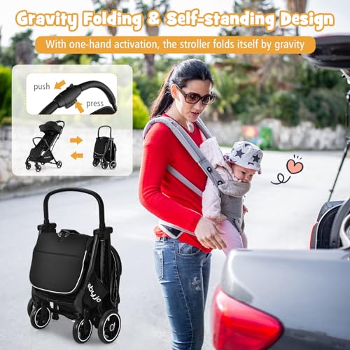 Gravity Folding Design: When not in use, the stroller can be folded into a compact size. And there is no need to bend down when folding thanks to the gravity folding design. The compact folding size and 7 kg light weight make the stroller easy to carry and store. And the size is also available for most airplanes. Note: You can take off the handle bar for tighter situations.