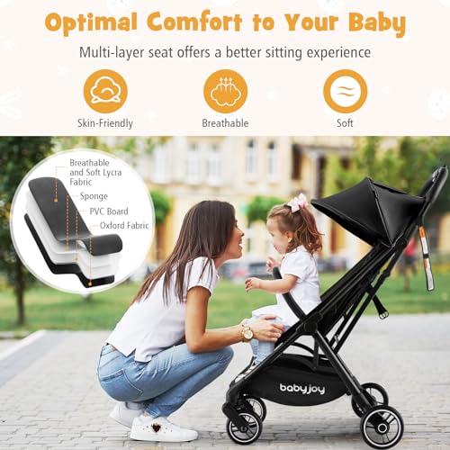 Adjust to Optimal Comfort: This cute infant stroller features 115°-150° adjustable backrest, 3-gear footrest and 2-level canopy. Therefore, it will be much easier to find the most comfortable position for your little one. The multi-layer seat with Lycra fabric surface is skin-friendly and soft, bringing optimal comfort to your baby.