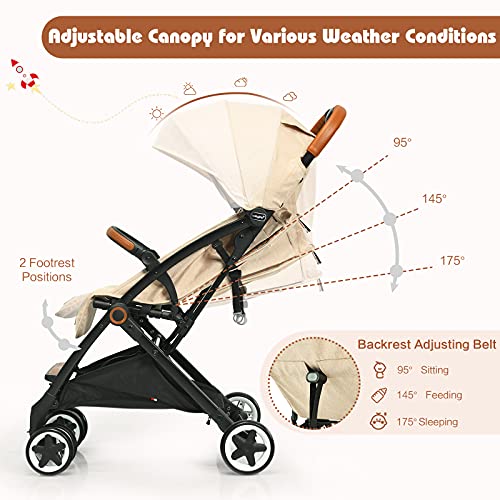 Multiple Adjustable Stroller: We combined flexible adjustment with this baby stroller. The backrest can be adjusted from 95°- 175°, offering your baby the right position for sitting, drinking, or sleeping. You can also make a corresponding adjustment of the footrest for the most comfortable position. What’s more, the telescopic canopy meets the needs of different weather conditions.
