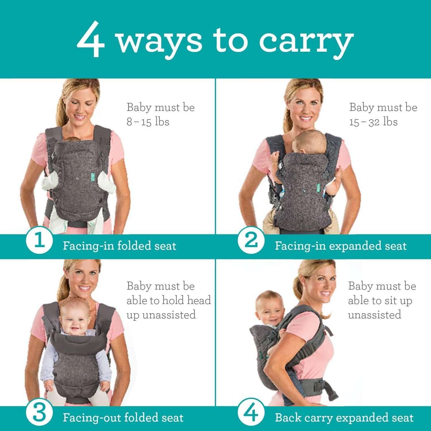This carrier offers four versatile carrying options: facing-in with a folded seat, facing-in with an expanded seat, facing-out, and back carry, accommodating various preferences and situations. Whether you’re going about your day with your baby in tow or need a convenient way to bond during walks, the Infantino Flip 4-in-1 Convertible Baby Carrier is the perfect choice.