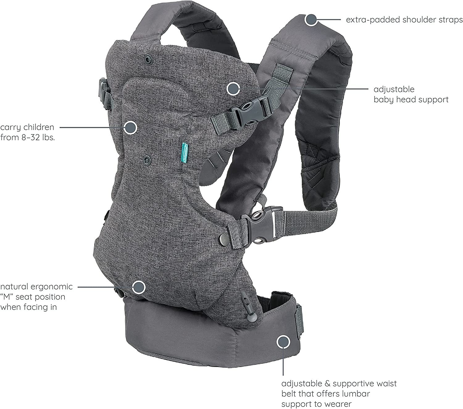 The Infantino Flip 4-in-1 Convertible Baby Carrier is a versatile and ergonomic solution designed to accompany your child from infancy through toddlerhood. Its unique convertible seat offers exceptional flexibility for different stages of your baby’s growth. For small infants, the narrow seat position and padded head support provide a snug and comfortable fit. As your child grows, easily switch to the wider seat position to maintain an ergonomic seating posture.