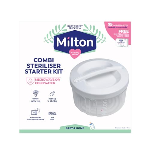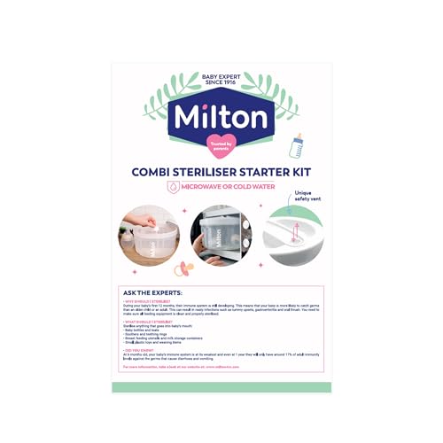 Milton 2 in 1 Combi Steriliser Starter Kit – Microwave or cold water. Unique safety vent technology for the best possible protection.