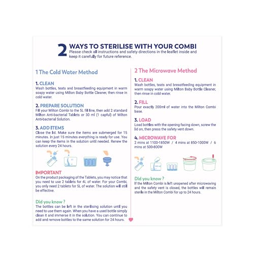 MICROWAVE METHOD 1. Clean – Wash bottles, teats and breastfeeding equipment in warm soapy water, then rinse in cold water 2. Fill – Pour exactly 200mL of water into the Milton Combi base 3. Load – Load bottles with the opening facing down, screw the lid on, then press the safety vent down 4. Microwave – 2 mins at 1100-1850W 4 mins at 850-1000W 6 mins at 500-800W Full instructions are inside – please read the leaflet carefully and keep for future reference