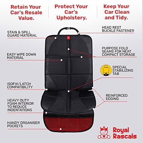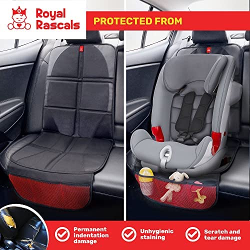 😄 CAR SEAT PROTECTOR & CAR SEAT ORGANISER: Protect your upholstery and keep your car’s interior organised with our must-have Royal Rascals Car Seat Protector. Designed for use with forward or rear-facing child seats, it features a high density padded mat to protect your car seat and stylish organizer pockets to keep your baby essentials handy, including snacks, baby wipes and child’s toys.