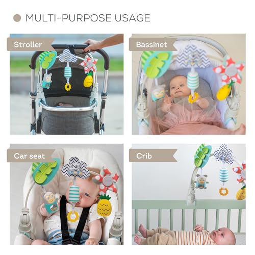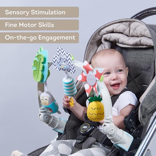 Taf Toys Tropical Orchestra Arch is a flexible pram arch with fascinating instrumental toys, to stimulate baby’s discovery of sounds, for baby’s senses and motor skills development. Ideal for easier outdoors and easier parenting. Sturdy arch clips to fit most strollers, prams, car seats and bouncers. Comes with a variety of instrumental toys – maracas monkey, chime bells toy with a teether and cymbal pineapple toy. Suitable for 0+ months of babies.