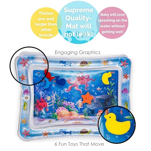 【Perfect Size】: Our baby water sensory mat size is 70cm wide by 50cm” long by 7cm high, each with five cute and colorful toys. It has enough space for 3 to 12 months old babies to play